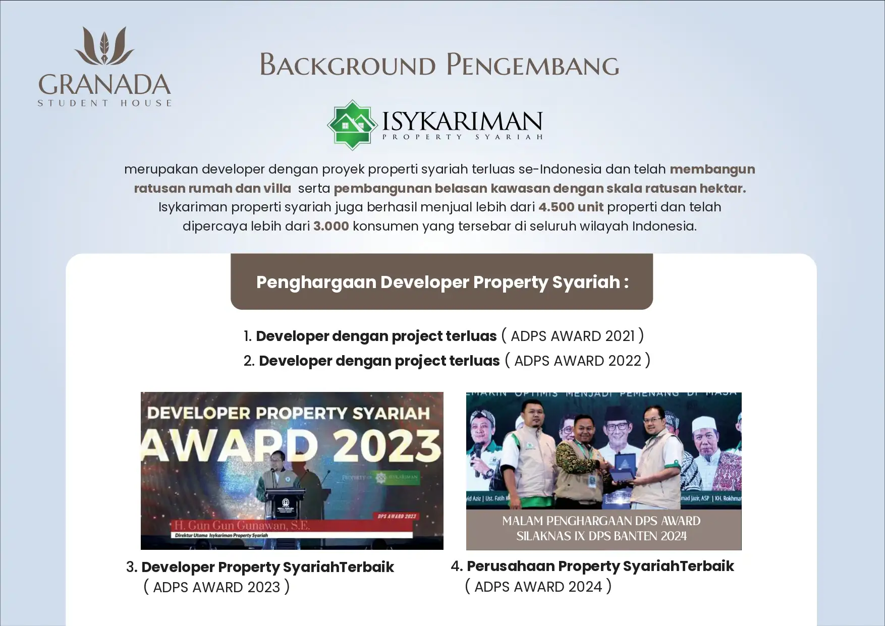 Telah Berhasil Meraih Penghargaan Developer Syariah Terbaik 2023 & 2024. Sentuhan penuh dedikasi menciptakan aset valuable yang lebih dari sekedar properti. Telah berhasil menghadirkan beragam properti yang berorientasi pada capital gain yang tinggi untuk ribuan investor.