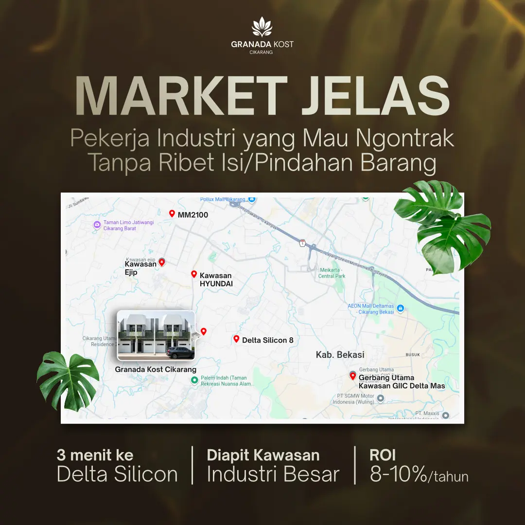 Bayangkan punya kost exclusive yang hanya 800 meter dari Delta Silicon, dikelilingi kawasan industri terbesar seperti EJIP, GIIC, MM2100, dan Hyundai — lokasi emas dengan ribuan pekerja aktif setiap hari!